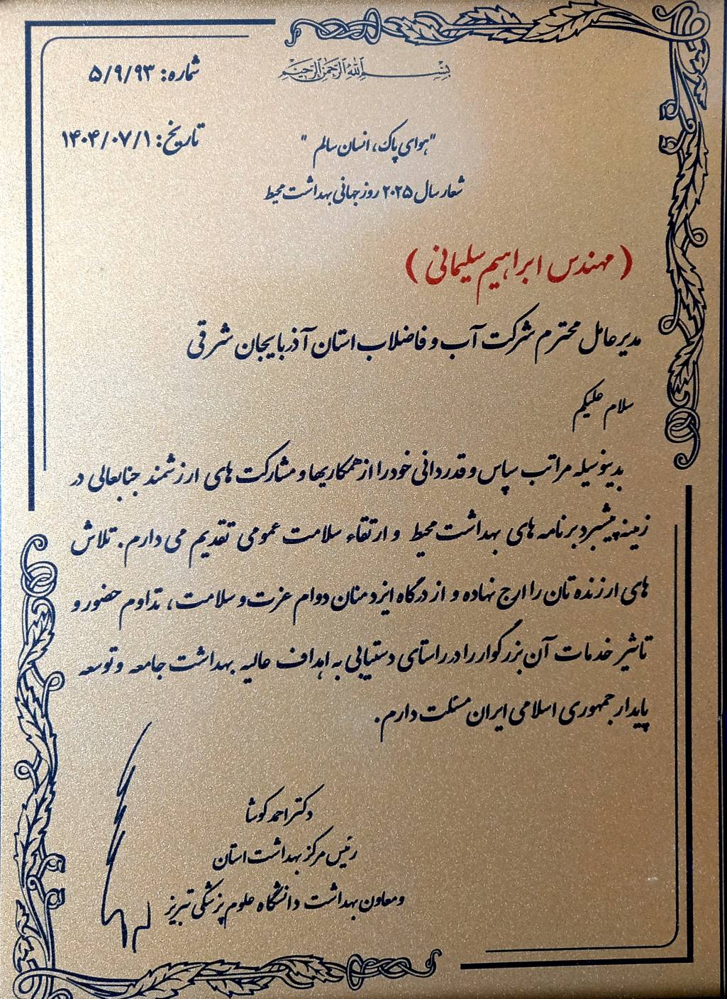 لوح سپاس اعطا شده به مدیرعامل آبفای استان، بیانگر اهمیت نقش این شرکت در ارتقای شاخصهای سلامت عمومی و بهبود کیفیت زندگی شهروندان است.