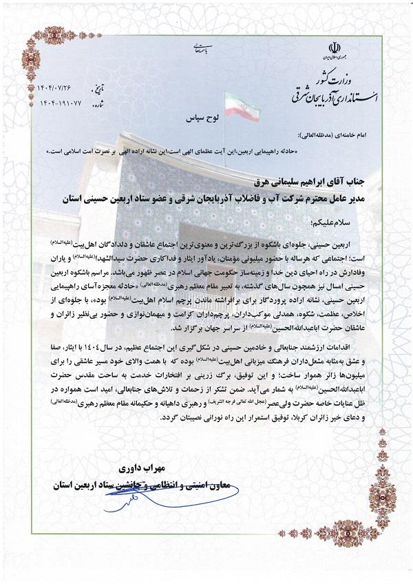 ضمن تشکر از زحمات و تلاش های جنابعالی، امید است همواره در ظل عنایات خاصه حضرت ولی عصر (عج) و رهبری داهیانه و حکیمانه مقام معظم رهبری (مدظله العالی) و دعای خیر زائران کربلا، توفیق استمرار این راه نورانی نصیبتان گردد. شایان ذکر است؛ شرکت آب و فاضلاب آذربایجان شرقی نیز همواره با مشارکت در برنامههای اربعین و پشتیبانی خدماتی، نقش مهمی در تسهیل امور زائران حسینی ایفا کرده است.