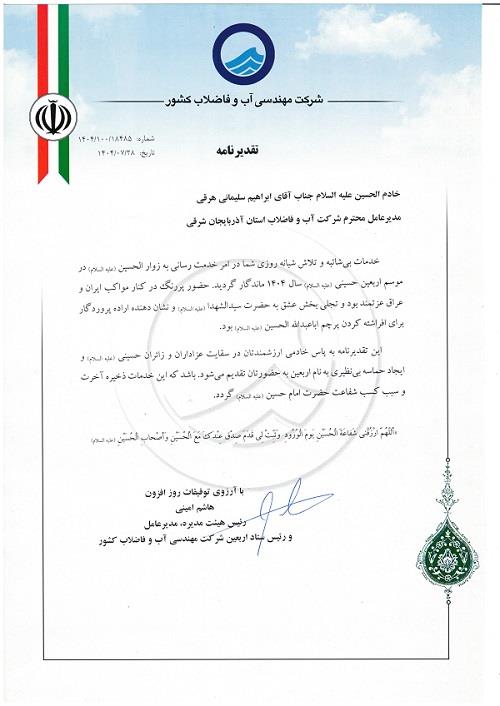 این تقدیرنامه با تأکید بر نقش برجسته شرکت آب و فاضلاب آذربایجانشرقی در سقایت عزاداران و زائران و همچنین خلق حماسهای کمنظیر در پشتیبانی از مراسم عظیم اربعین، به سلیمانی تقدیم شد.