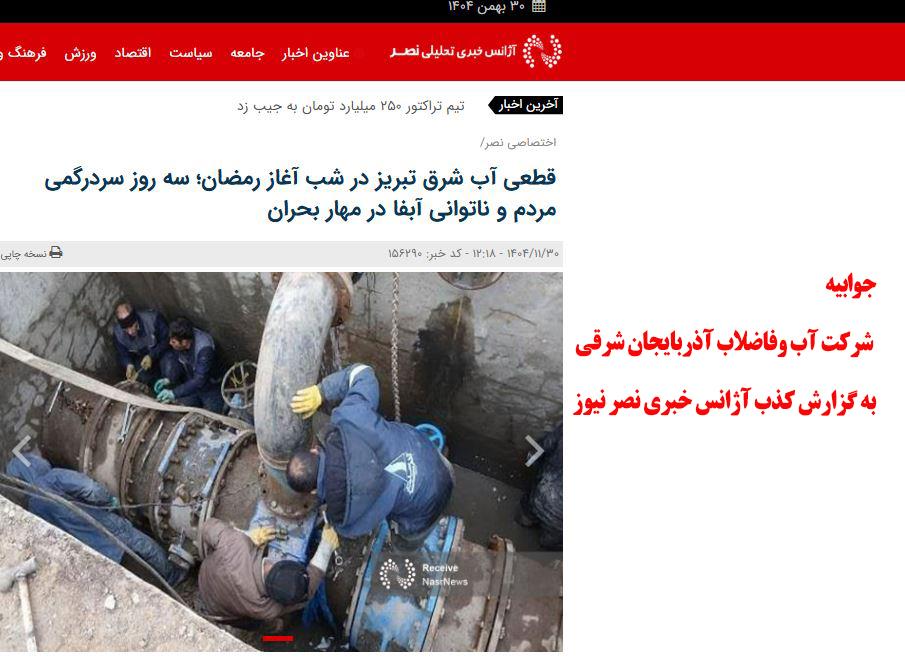 در پاسخ به گزارش کذب آژانس خبری نصر نیوز در خصوص ناتوانی در مهار بحران که در فضای مجازی منتشر شده است ، به استحضار می رساند همچنانکه در اطلاعیه مورخ ۱۴۰۴/۱۱/۲۸ این شرکت اعلام شده بود افت فشار آب مسیر جاده ائل گلی در روزهای اخیر مربوط به مشکل نشتی در ایستگاه پمپاژ ۱۱ خط آبرسانی زرینه رود واقع در فاز ۲ شهرک اندیشه بوده و هیچ ارتباطی به تاسیسات توزیع شرکت آب‌ و فاضلاب ندارد.