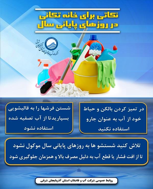 مدیرعامل شرکت آب و فاضلاب آذربایجان شرقی با اشاره به افزایش مصرف آب در روزهای پایانی سال، از شهروندان خواست با رعایت الگوی مصرف و مدیریت صحیح، از هدررفت آب در ایام خانه‌تکانی نوروز جلوگیری کنند تا پایداری خدمات آبرسانی برای همه مشترکان حفظ شود.